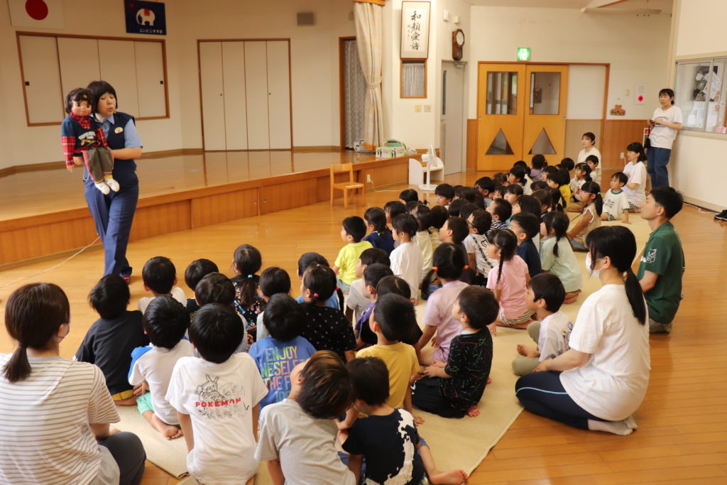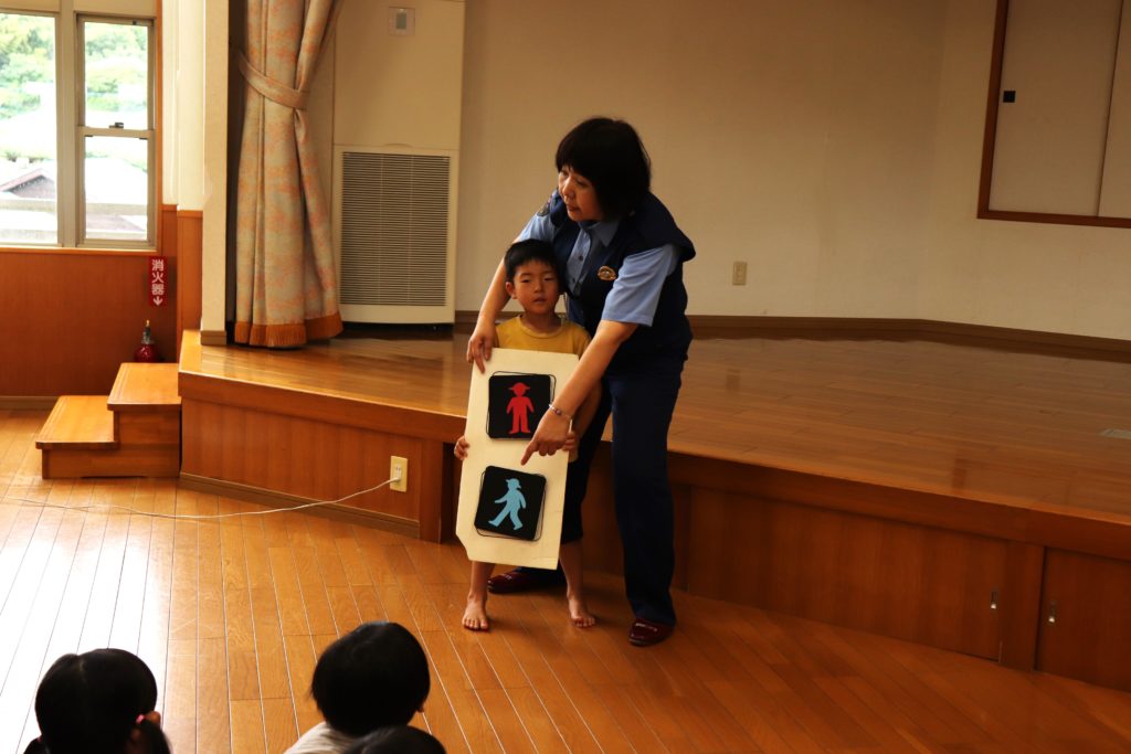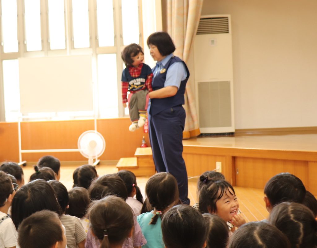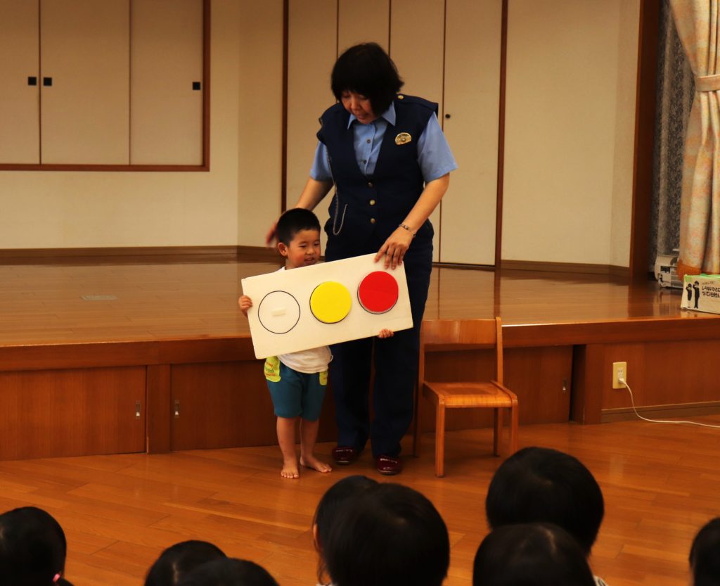 柳井警察署交通総務課係長の西村真由美さんをお迎えし、3歳児以上を対象に交通安全教室を行いました。西村係長さんは可愛いお友だち『おちゃめさん』をお供に連れて来られて、楽しいお話を展開して下さいました。