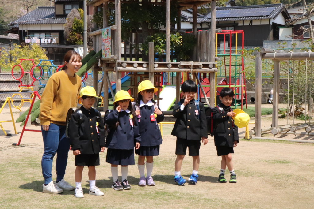 入学式を済ませた卒園生が、ランドセル姿を見せに来てくれました。鯉のぼりが上がっているのに気づき記念撮影ということになりました。とっても嬉しい来客です。