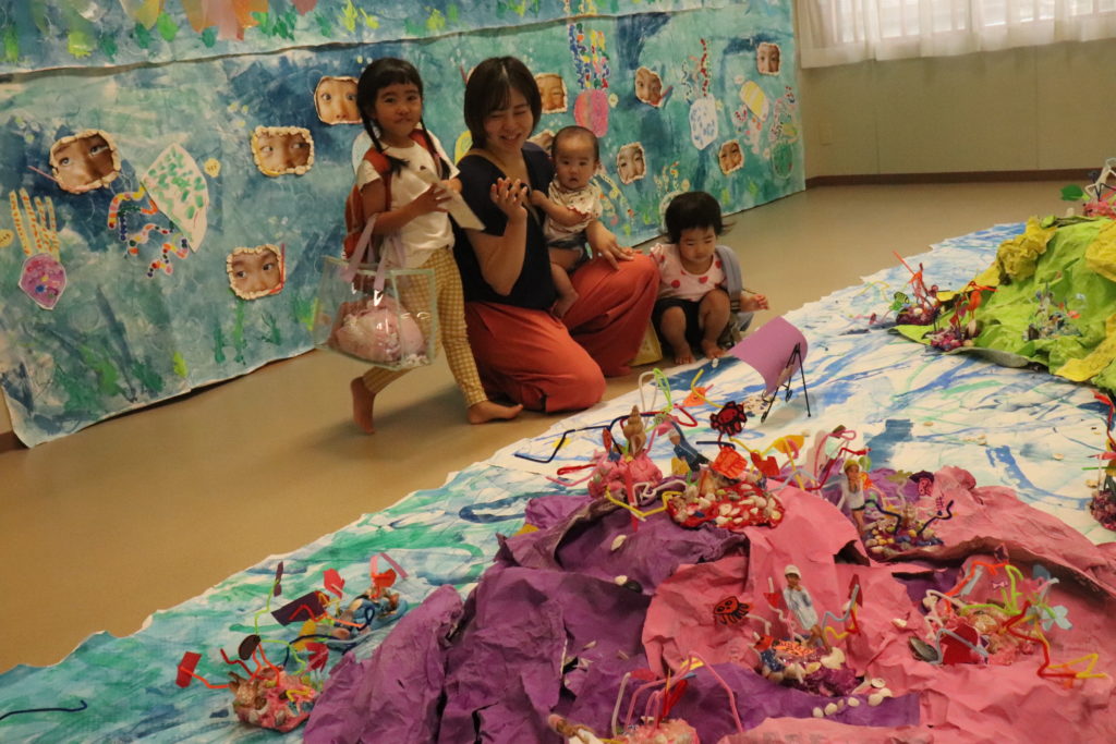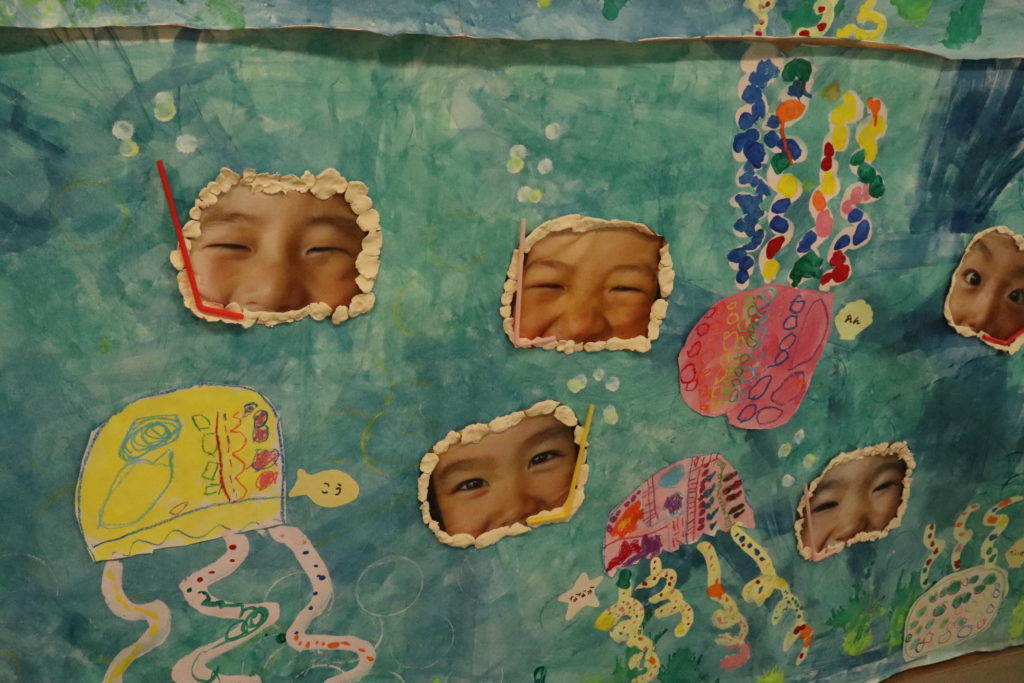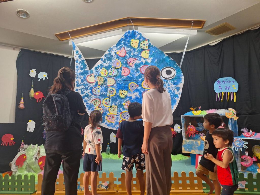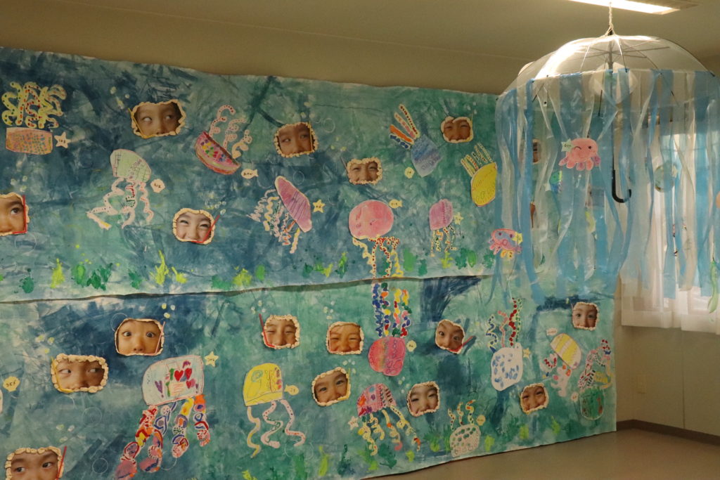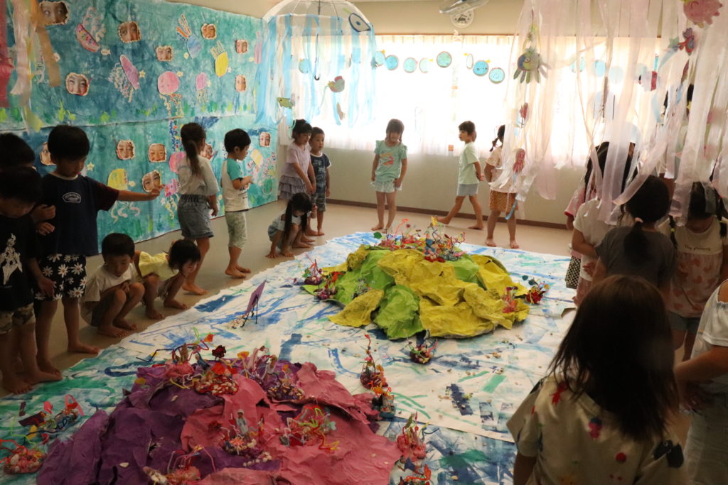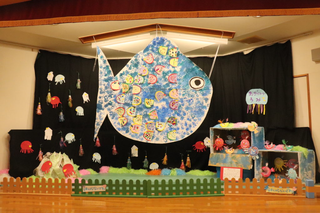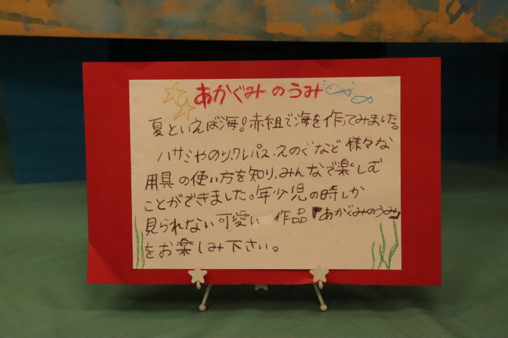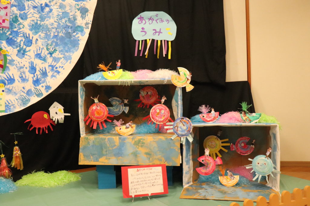遊戯室ステージとわくわくルームにおいて、3歳以上児さんの作品展を開催しました。例年は冬に開催していましたが、今年は夏の開催となりました。テーマは「海」