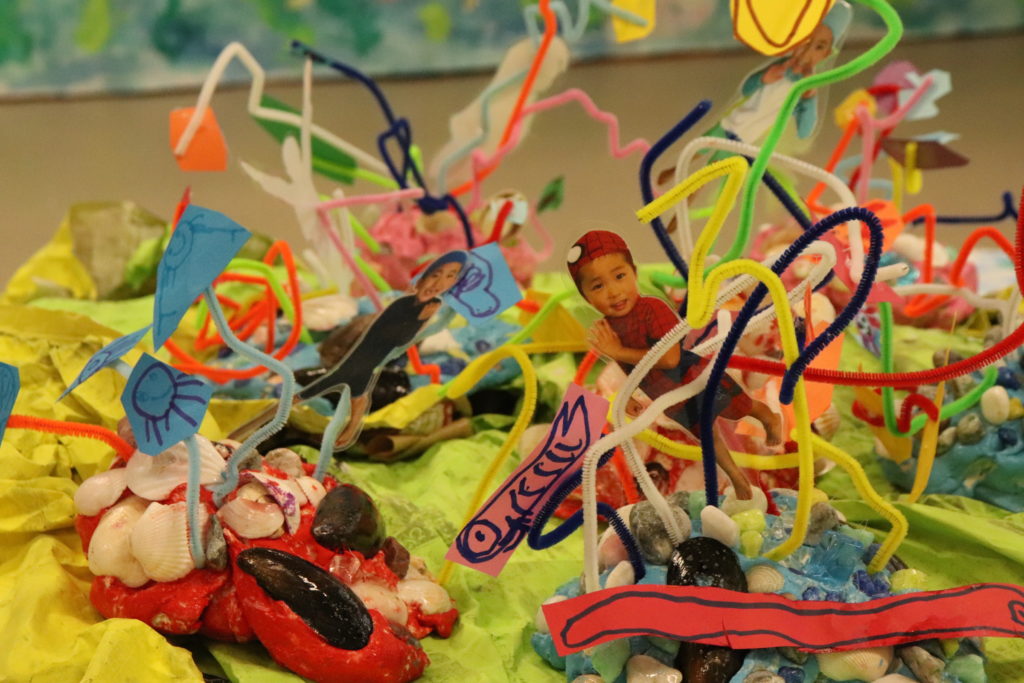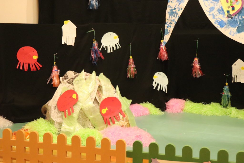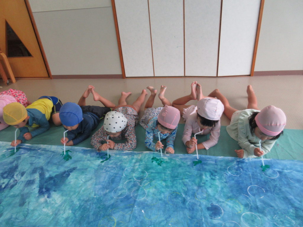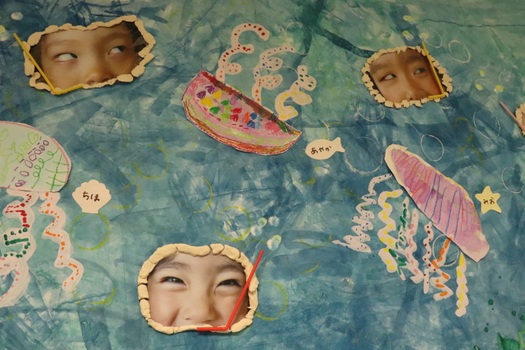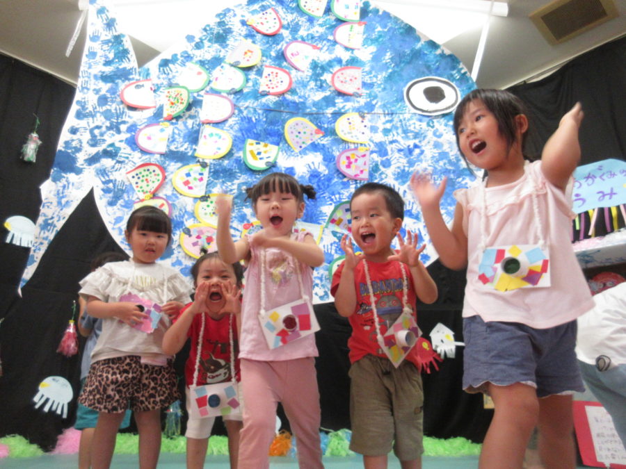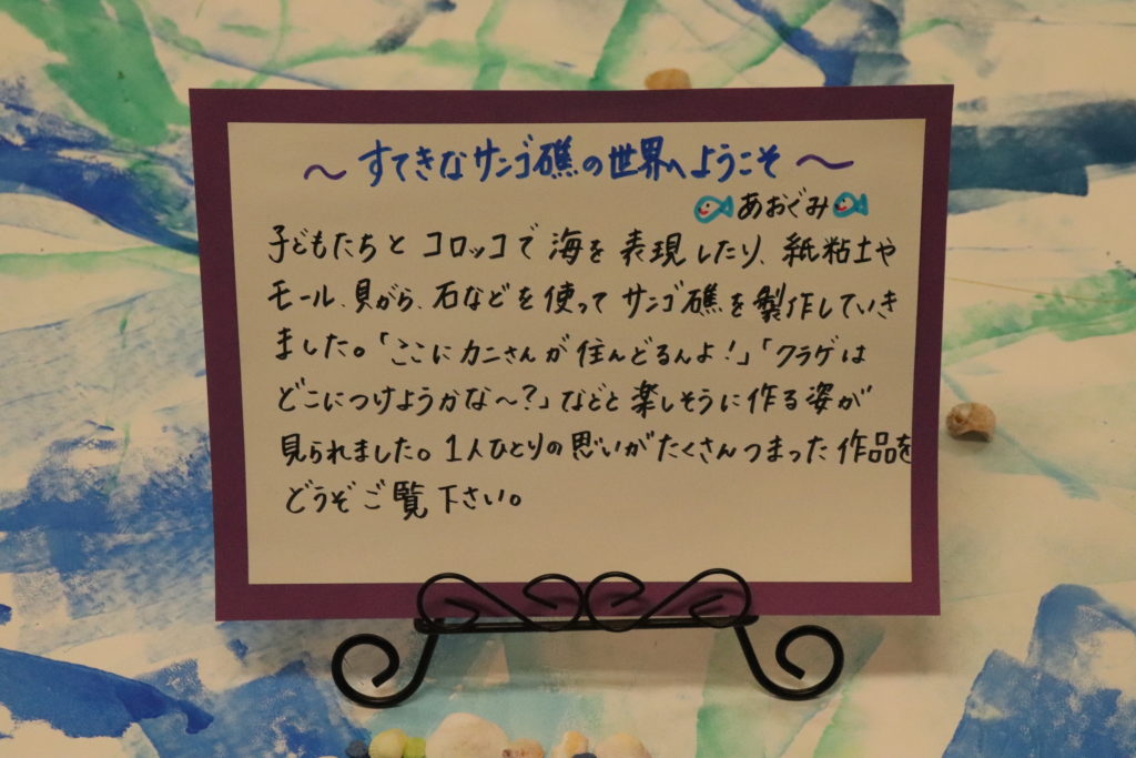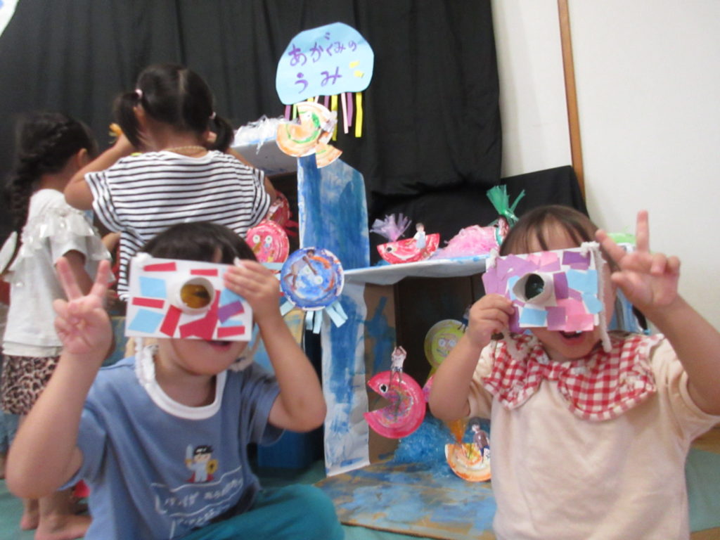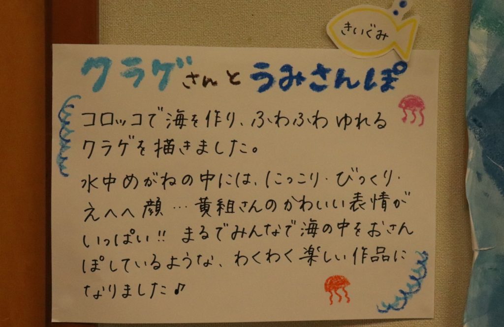 遊戯室ステージとわくわくルームにおいて、3歳以上児さんの作品展を開催しました。例年は冬に開催していましたが、今年は夏の開催となりました。テーマは「海」