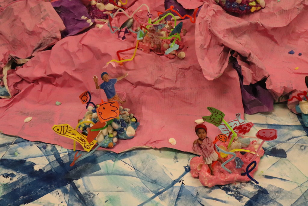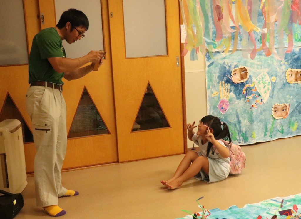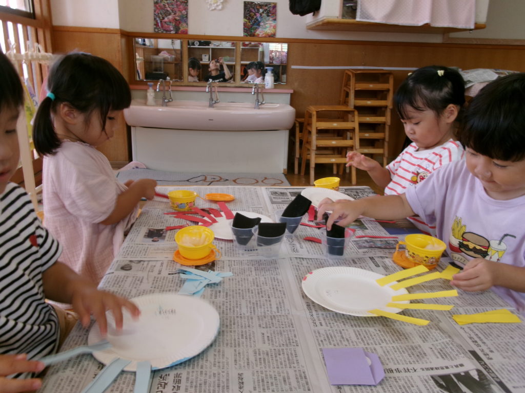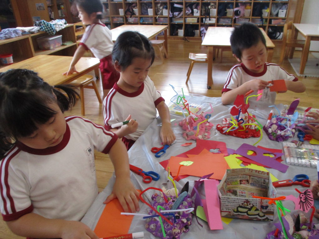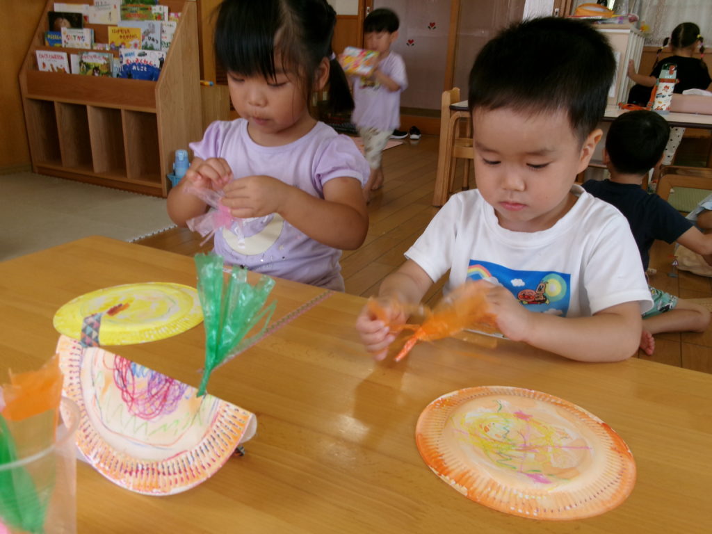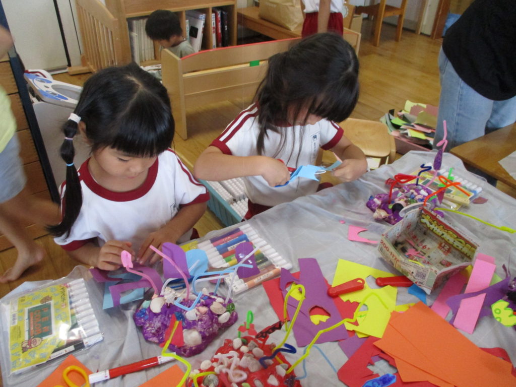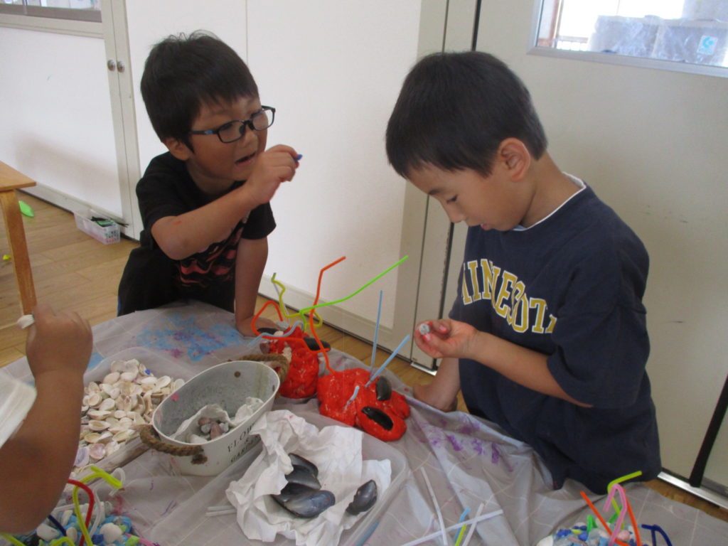 遊戯室ステージとわくわくルームにおいて、3歳以上児さんの作品展を開催しました。例年は冬に開催していましたが、今年は夏の開催となりました。テーマは「海」