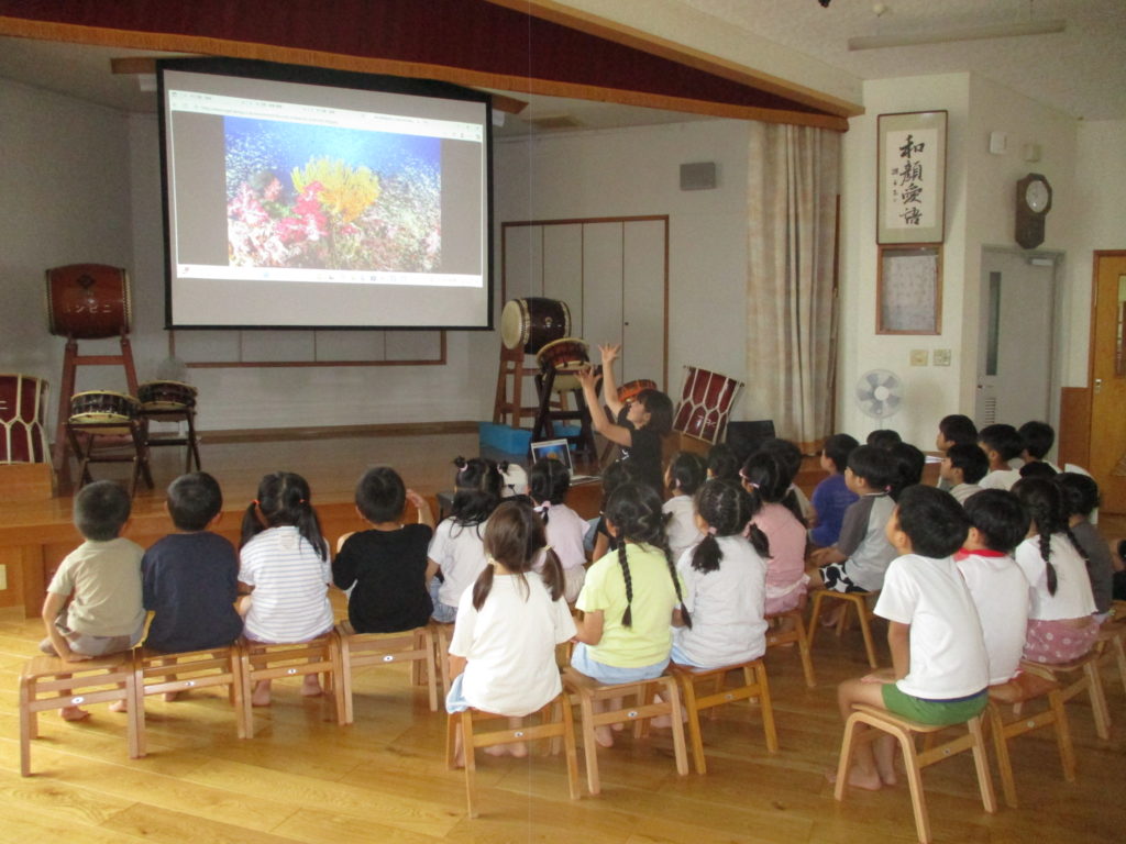 海の話をする中で、子どもたちがサンゴ礁に興味をしめしたので、映像を見ながらサンゴについて学びました。サンゴ礁には色とりどりのきれいな魚が泳いでいます。